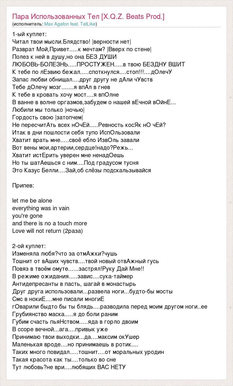 1-ый куплет: Читал твои мысли.Блядство! |верности нет| Разврат Мой,Привет.....к мечтам? |Вверх по стене| Полез к ней в душу,но она БЕЗ ДУШИ ЛЮБОВЬ-БОЛЕЗНЬ.....ПРОСТУЖЕН.....в твою БЕЗДНУ ВШИТ К тебе по лЕзвию бежал.....споткнулся....стоп!!!....дОлечУ Запас любви обнищал....друг другу не дАли чУвств Тебе дОлечу мозг.......я впАл в гнев К тебе в кровать хочу мост....я впОлне В ванне в волне оргазмов,забудем о нашей вЕчной вОйнЕ... Любили мы только |ночью| Гордость свою |затопчем| Не пересчитАть всех нОчЕй.....Ревность косЯк нО чЕй? Итак в дни пошлости себя тупо ИспОльзовали Хватит врать мне.....своё ебло ИзвОль завали Вот вены мои,артерии,сердце!надо?Режь... Хватит истЕрить уверен мне ненадОешь Но ты шатАешься с ним....Под градусом тусня Это Казус Белли....Зай,об слёзы подскальзывайся Припев: let me be alone everything was in vain you're gone and there is no a touch more Love will not return (2раза) 2-ой куплет: Изменяла любя?что за отмАжки?чушь Тошнит от вАших чувств....твой новый отвАжный гусь Повяз в твоём омуте......застрял!Руку Дай Мне!! В режиме ожидания.....завис....сука-таймер Антидепресанты в пасть, шагай в монастырь Друг друга использовали...развела ноги...будто-бы мосты Смс в нокиЕ....мне писали многиЕ гОварили быдто бы ты блядь....разводила перед моим другом ноги..ее Грубиянство маска.....я до боли раним Губим счасть пьяНством.....яда в горло двоим В ссоре вечной...ага....привык уже Принимаю твои выходки...да....максим окУшер Маленькая вроде....но принимаешь в ротик.... Таких много повидал.....тошнит....от моральных уродин Такая красота как ты....только во сне Тут любовь?не ври....любящих ВАС НЕТУ