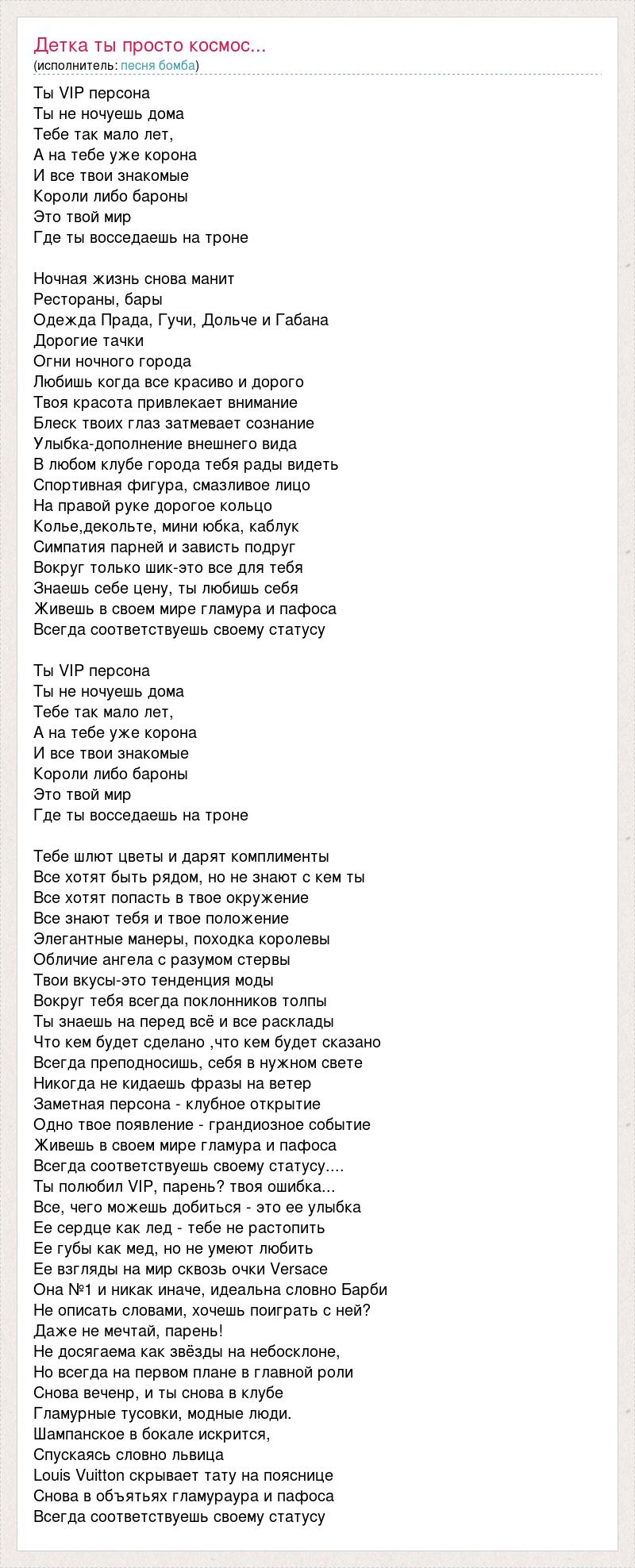 Ты VIP персона Ты не ночуешь дома Тебе так мало лет, А на тебе уже корона И все твои знакомые Короли либо бароны Это твой мир Где ты восседаешь на троне Ночная жизнь снова манит Рестораны, бары Одежда Прада, Гучи, Дольче и Габана Дорогие тачки Огни ночного города Любишь когда все красиво и дорого Твоя красота привлекает внимание Блеск твоих глаз затмевает сознание Улыбка-дополнение внешнего вида В любом клубе города тебя рады видеть Спортивная фигура, смазливое лицо На правой руке дорогое кольцо Колье,декольте, мини юбка, каблук Симпатия парней и зависть подруг Вокруг только шик-это все для тебя Знаешь себе цену, ты любишь себя Живешь в своем мире гламура и пафоса Всегда соответствуешь своему статусу Ты VIP персона Ты не ночуешь дома Тебе так мало лет, А на тебе уже корона И все твои знакомые Короли либо бароны Это твой мир Где ты восседаешь на троне Тебе шлют цветы и дарят комплименты Все хотят быть рядом, но не знают с кем ты Все хотят попасть в твое окружение Все знают тебя и твое положение Элегантные манеры, походка королевы Обличие ангела с разумом стервы Твои вкусы-это тенденция моды Вокруг тебя всегда поклонников толпы Ты знаешь на перед всё и все расклады Что кем будет сделано ,что кем будет сказано Всегда преподносишь, себя в нужном свете Никогда не кидаешь фразы на ветер Заметная персона - клубное открытие Одно твое появление - грандиозное событие Живешь в своем мире гламура и пафоса Всегда соответствуешь своему статусу.... Ты полюбил VIP, парень? твоя ошибка... Все, чего можешь добиться - это ее улыбка Ее сердце как лед - тебе не растопить Ее губы как мед, но не умеют любить Ее взгляды на мир сквозь очки Versace Она №1 и никак иначе, идеальна словно Барби Не описать словами, хочешь поиграть с ней? Даже не мечтай, парень! Не досягаема как звёзды на небосклоне, Но всегда на первом плане в главной роли Снова веченр, и ты снова в клубе Гламурные тусовки, модные люди. Шампанское в бокале искрится, Спускаясь словно львица Louis Vuitton скрывает тату на пояснице Снова в объятьях гламураура и пафоса Всегда соответствуешь своему статусу