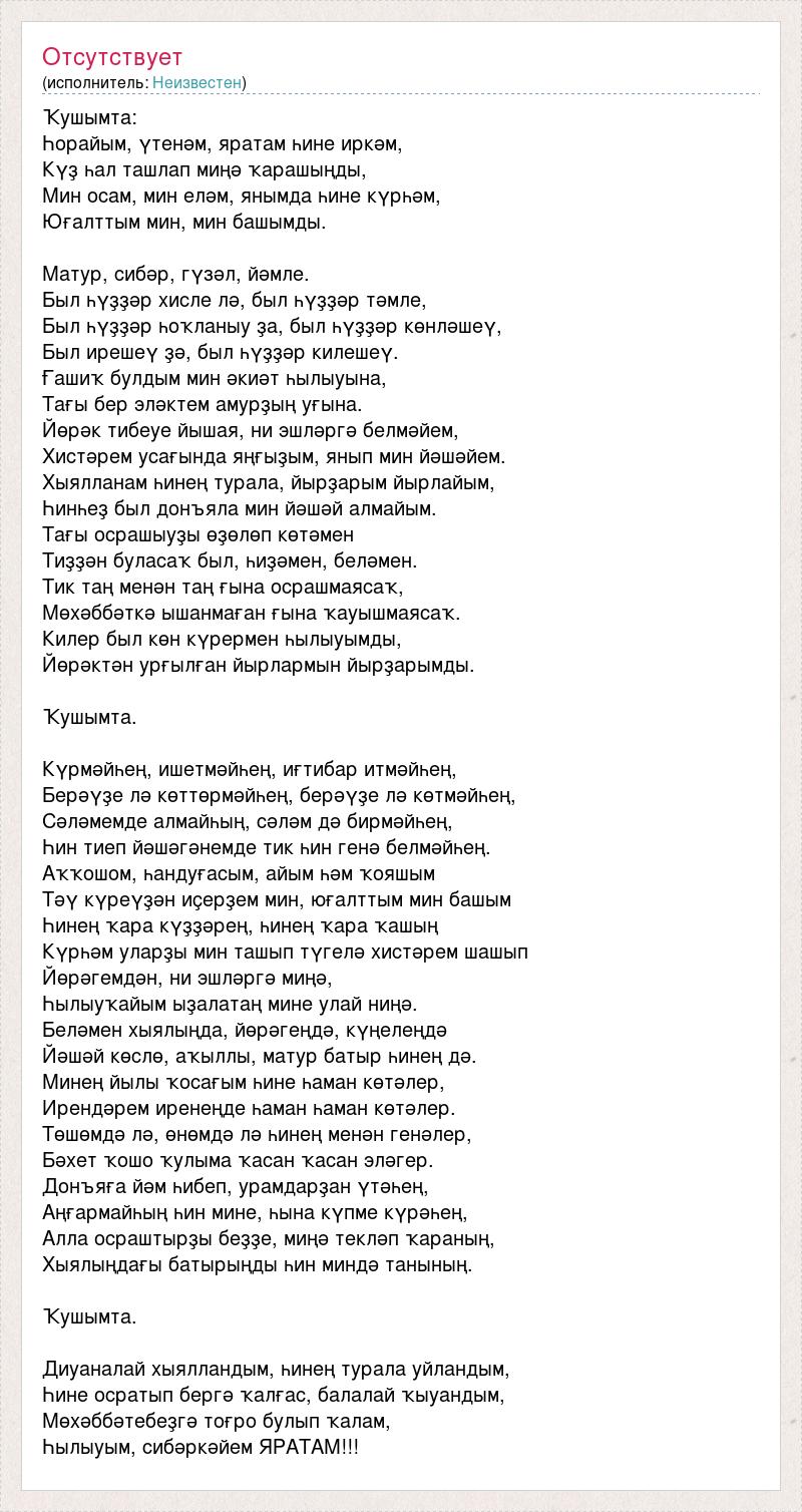 Ҡушымта: Һорайым, үтенәм, яратам һине иркәм, Күҙ һал ташлап миңә ҡарашыңды, Мин осам, мин еләм, янымда һине күрһәм, Юғалттым мин, мин башымды. Матур, сибәр, гүзәл, йәмле. Был һүҙҙәр хисле лә, был һүҙҙәр тәмле, Был һүҙҙәр һоҡланыу ҙа, был һүҙҙәр көнләшеү, Был ирешеү ҙә, был һүҙҙәр килешеү. Ғашиҡ булдым мин әкиәт һылыуына, Тағы бер эләктем амурҙың уғына. Йөрәк тибеуе йышая, ни эшләргә белмәйем, Хистәрем усағында яңғыҙым, янып мин йәшәйем. Хыялланам һинең турала, йырҙарым йырлайым, Һинһеҙ был донъяла мин йәшәй алмайым. Тағы осрашыуҙы өҙөлөп көтәмен Тиҙҙән буласаҡ был, һиҙәмен, беләмен. Тик таң менән таң ғына осрашмаясаҡ, Мөхәббәткә ышанмаған ғына ҡауышмаясаҡ. Килер был көн күрермен һылыуымды, Йөрәктән урғылған йырлармын йырҙарымды. Ҡушымта. Күрмәйһең, ишетмәйһең, иғтибар итмәйһең, Берәүҙе лә көттөрмәйһең, берәүҙе лә көтмәйһең, Сәләмемде алмайһың, сәләм дә бирмәйһең, Һин тиеп йәшәгәнемде тик һин генә белмәйһең. Аҡҡошом, һандуғасым, айым һәм ҡояшым Тәү күреүҙән иҫерҙем мин, юғалттым мин башым Һинең ҡара күҙҙәрең, һинең ҡара ҡашың Күрһәм уларҙы мин ташып түгелә хистәрем шашып Йөрәгемдән, ни эшләргә миңә, Һылыуҡайым ыҙалатаң мине улай ниңә. Беләмен хыялыңда, йөрәгеңдә, күңелеңдә Йәшәй көслө, аҡыллы, матур батыр һинең дә. Минең йылы ҡосағым һине һаман көтәлер, Ирендәрем иренеңде һаман һаман көтәлер. Төшөмдә лә, өнөмдә лә һинең менән генәлер, Бәхет ҡошо ҡулыма ҡасан ҡасан эләгер. Донъяға йәм һибеп, урамдарҙан үтәһең, Аңғармайһың һин мине, һына күпме күрәһең, Алла осраштырҙы беҙҙе, миңә текләп ҡараның, Хыялыңдағы батырыңды һин миндә танының. Ҡушымта. Диуаналай хыялландым, һинең турала уйландым, Һине осратып бергә ҡалғас, балалай ҡыуандым, Мөхәббәтебеҙгә тоғро булып ҡалам, Һылыуым, сибәркәйем ЯРАТАМ!!!