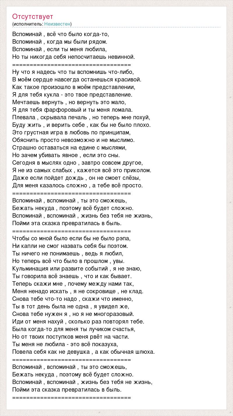 Вспоминай , всё что было когда-то, Вспоминай , когда мы были рядом. Вспоминай , если ты меня любила, Но ты никогда себя непосчитаешь невинной. ================================== Ну что я надесь что ты вспомнишь что-либо, В моём сердце навсегда останешься красивой. Как такое произошло в моём представлении, Я для тебя кукла - это твое представление. Мечтаешь вернуть , но вернуть это мало, Я для тебя фарфоровый и ты меня ломала. Плевала , скрывала печаль , но теперь мне похуй, Буду жить , и верить себе , как бы не было плохо. Это грустная игра в любовь по принципам, Обяснить просто невозможно и не мыслимо. Страшно оставаться на едине с мыслями, Но зачем убивать явное , если это сны. Сегодня в мыслях одно , завтро совсем другое, Я не из самых слабых , кажется всё это приколом. Даже если пойдет дождь , он не смоет слёзы, Для меня казалось сложно , а тебе всё просто. ================================== Вспоминай , вспоминай , ты это сможешь, Бежать некуда , поэтому всё будет сложно. Вспоминай , вспоминай , жизнь без тебя не жизнь, Пойми эта сказка превратилась в быль. ================================== Чтобы со мной было если бы не было рэпа, Ни капли не смог назвать себя бы поэтом. Ты ничего не понимаешь , ведь я любил, Но теперь всё что было в прошлом , увы. Кульминация или развите событий , я не знаю, Ты говорила всё знаешь , что и как бывает. Теперь скажи мне , почему между нами так, Меня ненадо искать , я не сокровище , не клад. Снова тебе что-то надо , скажи что именно, Ты в тот день была не одна , я увидел же, Снова тебе нужен я , но я не многоразовый. Иди от меня нахуй , сколько раз повторял тебе. Была когда-то для меня ты лучиком счастья, Но от твоих поступков меня рвёт на части. Ты меня не любила - это всё показуха, Повела себя как не девушка , а как обычная шлюха. ================================== Вспоминай , вспоминай , ты это сможешь, Бежать некуда , поэтому всё будет сложно. Вспоминай , вспоминай , жизнь без тебя не жизнь, Пойми эта сказка превратилась в быль. ==================================