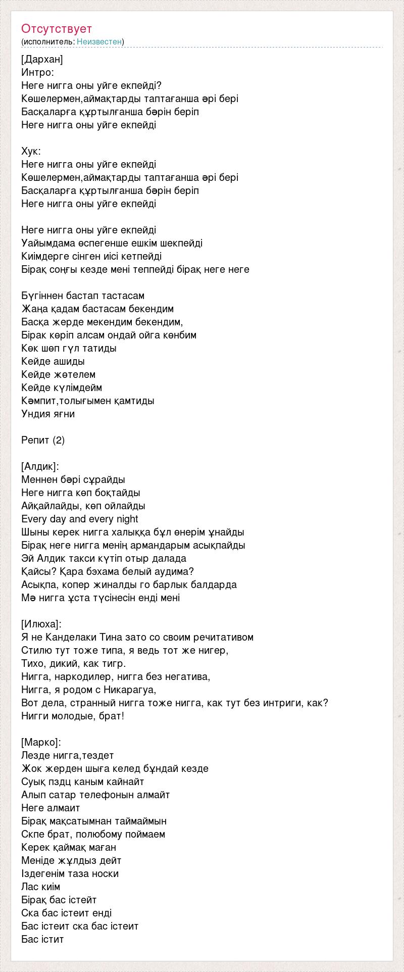 [Дархан] Интро: Неге нигга оны уйге екпейді? Көшелермен,аймақтарды таптағанша əрі бері Басқаларға құртылғанша бəрін беріп Неге нигга оны уйге екпейді Хук: Неге нигга оны уйге екпейді Көшелермен,аймақтарды таптағанша əрі бері Басқаларға құртылғанша бəрін беріп Неге нигга оны уйге екпейді Неге нигга оны уйге екпейді Уайымдама өспегенше ешкім шекпейді Киімдерге сінген иісі кетпейді Бірақ соңғы кезде мені теппейді бірақ неге неге Бүгіннен бастап тастасам Жаңа қадам бастасам бекендим Басқа жерде мекендим бекендим, Бiрак көріп алсам ондай ойга көнбим Көк шөп гүл татиды Кейде ашиды Кейде жөтелем Кейде күлімдейм Кəмпит,толығымен қамтиды Ундия яғни Репит🔄(2) [Алдик]: Меннен бəрі сұрайды Неге нигга көп боқтайды Айқайлайды, көп ойлайды Every day and every night Шыны керек нигга халыққа бұл өнерім ұнайды Бірақ неге нигга менің армандарым асықпайды Эй Алдик такси күтіп отыр далада Қайсы? Қара бэхама белый аудима? Асықпа, копер жиналды го барлык балдарда Мə нигга ұста түсінесін енді мені [Илюха]: Я не Канделаки Тина зато со своим речитативом Стилю тут тоже типа, я ведь тот же нигер, Тихо, дикий, как тигр. Нигга, наркодилер, нигга без негатива, Нигга, я родом с Никарагуа, Вот дела, странный нигга тоже нигга, как тут без интриги, как? Нигги молодые, брат! [Марко]: Лезде нигга,тездет Жок жерден шыға келед бұндай кезде Суық пздц каным кайнайт Алып сатар телефонын алмайт Неге алмаит Бірақ мақсатымнан таймаймын Скпе брат, полюбому поймаем Керек қаймақ маған Меніде жұлдыз дейт Іздегенім таза носки Лас киім Бірақ бас істейт Ска бас істеит енді Бас істеит ска бас істеит Бас істит