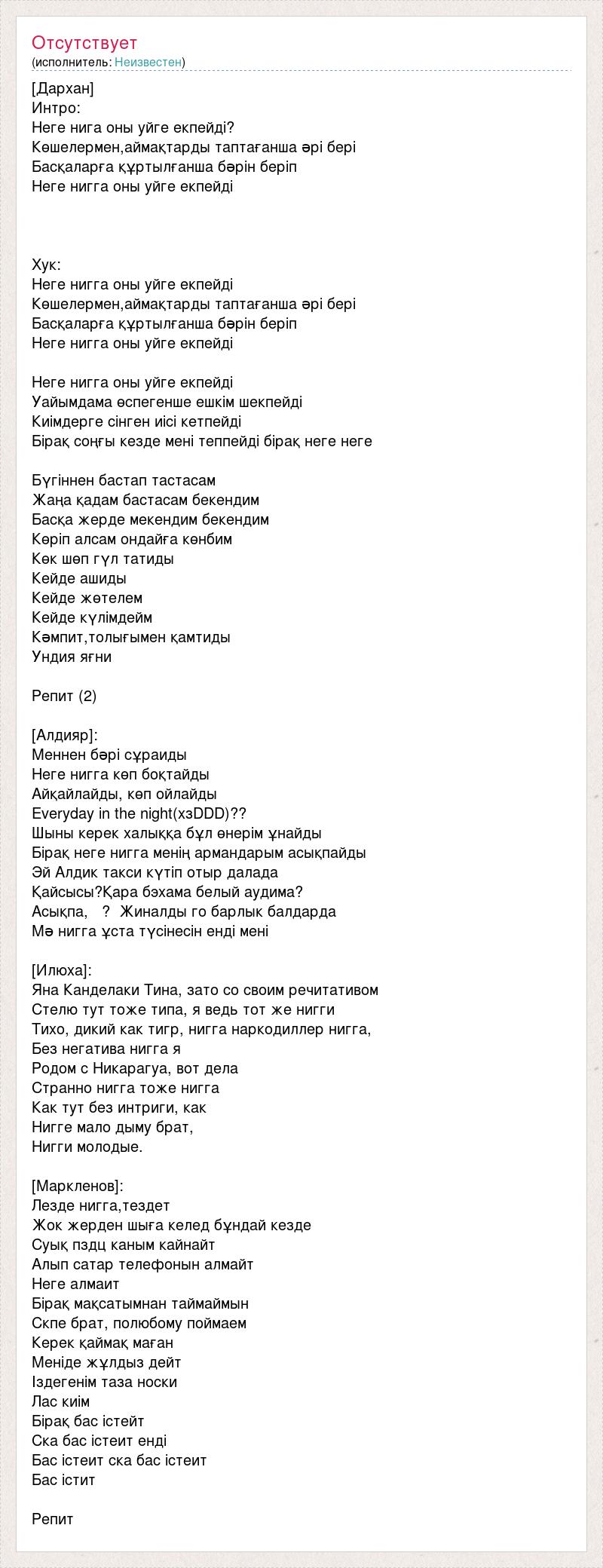 [Дархан] Интро: Неге нига оны уйге екпейді? Көшелермен,аймақтарды таптағанша əрі бері Басқаларға құртылғанша бəрін беріп Неге нигга оны уйге екпейді 🎶🎶🎶 Хук: Неге нигга оны уйге екпейді Көшелермен,аймақтарды таптағанша əрі бері Басқаларға құртылғанша бəрін беріп Неге нигга оны уйге екпейді Неге нигга оны уйге екпейді Уайымдама өспегенше ешкім шекпейді Киімдерге сінген иісі кетпейді Бірақ соңғы кезде мені теппейді бірақ неге неге Бүгіннен бастап тастасам Жаңа қадам бастасам бекендим Басқа жерде мекендим бекендим Көріп алсам ондайға көнбим Көк шөп гүл татиды Кейде ашиды Кейде жөтелем Кейде күлімдейм Кəмпит,толығымен қамтиды Ундия яғни Репит🔄(2) [Алдияр]: Меннен бəрі сұраиды Неге нигга көп боқтайды Айқайлайды, көп ойлайды Everyday in the night(хзDDD)?? Шыны керек халыққа бұл өнерім ұнайды Бірақ неге нигга менің армандарым асықпайды Эй Алдик такси күтіп отыр далада Қайсысы?Қара бэхама белый аудима? Асықпа, ? Жиналды го барлык балдарда Мə нигга ұста түсінесін енді мені [Илюха]: Яна Канделаки Тина, зато со своим речитативом Стелю тут тоже типа, я ведь тот же нигги Тихо, дикий как тигр, нигга наркодиллер нигга, Без негатива нигга я Родом с Никарагуа, вот дела Странно нигга тоже нигга Как тут без интриги, как Нигге мало дыму брат, Нигги молодые. [Маркленов]: Лезде нигга,тездет Жок жерден шыға келед бұндай кезде Суық пздц каным кайнайт Алып сатар телефонын алмайт Неге алмаит Бірақ мақсатымнан таймаймын Скпе брат, полюбому поймаем Керек қаймақ маған Меніде жұлдыз дейт Іздегенім таза носки Лас киім Бірақ бас істейт Ска бас істеит енді Бас істеит ска бас істеит Бас істит Репит🔄