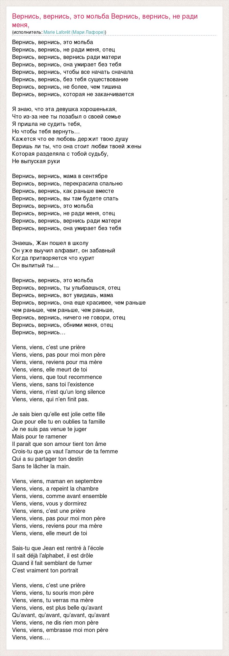 Вернись, вернись, это мольба Вернись, вернись, не ради меня, отец Вернись, вернись, вернись ради матери Вернись, вернись, она умирает без тебя Вернись, вернись, чтобы все начать сначала Вернись, вернись, без тебя существование Вернись, вернись, не более, чем тишина Вернись, вернись, которая не заканчивается Я знаю, что эта девушка хорошенькая, Что из-за нее ты позабыл о своей семье Я пришла не судить тебя, Но чтобы тебя вернуть… Кажется что ее любовь держит твою душу Веришь ли ты, что она стоит любви твоей жены Которая разделяла с тобой судьбу, Не выпуская руки Вернись, вернись, мама в сентябре Вернись, вернись, перекрасила спальню Вернись, вернись, как раньше вместе Вернись, вернись, вы там будете спать Вернись, вернись, это мольба Вернись, вернись, не ради меня, отец Вернись, вернись, вернись ради матери Вернись, вернись, она умирает без тебя Знаешь, Жан пошел в школу Он уже выучил алфавит, он забавный Когда притворяется что курит Он вылитый ты… Вернись, вернись, это мольба Вернись, вернись, ты улыбаешься, отец Вернись, вернись, вот увидишь, мама Вернись, вернись, она еще красивее, чем раньше чем раньше, чем раньше, чем раньше, Вернись, вернись, ничего не говори, отец Вернись, вернись, обними меня, отец Вернись, вернись… Viens, viens, c’est une prière Viens, viens, pas pour moi mon père Viens, viens, reviens pour ma mère Viens, viens, elle meurt de toi Viens, viens, que tout recommence Viens, viens, sans toi l’existence Viens, viens, n’est qu’un long silence Viens, viens, qui n’en finit pas. Je sais bien qu’elle est jolie cette fille Que pour elle tu en oublies ta famille Je ne suis pas venue te juger Mais pour te ramener Il parait que son amour tient ton âme Crois-tu que ça vaut l’amour de ta femme Qui a su partager ton destin Sans te lâcher la main. Viens, viens, maman en septembre Viens, viens, a repeint la chambre Viens, viens, comme avant ensemble Viens, viens, vous y dormirez Viens, viens, c’est une prière Viens, viens, pas pour moi mon père Viens, viens, reviens pour ma mère Viens, viens, elle meurt de toi Sais-tu que Jean est rentré à l’école Il sait déjà l’alphabet, il est drôle Quand il fait semblant de fumer C’est vraiment ton portrait Viens, viens, c’est une prière Viens, viens, tu souris mon père Viens, viens, tu verras ma mère Viens, viens, est plus belle qu’avant Qu’avant, qu’avant, qu’avant, qu’avant Viens, viens, ne dis rien mon père Viens, viens, embrasse moi mon père Viens, viens….