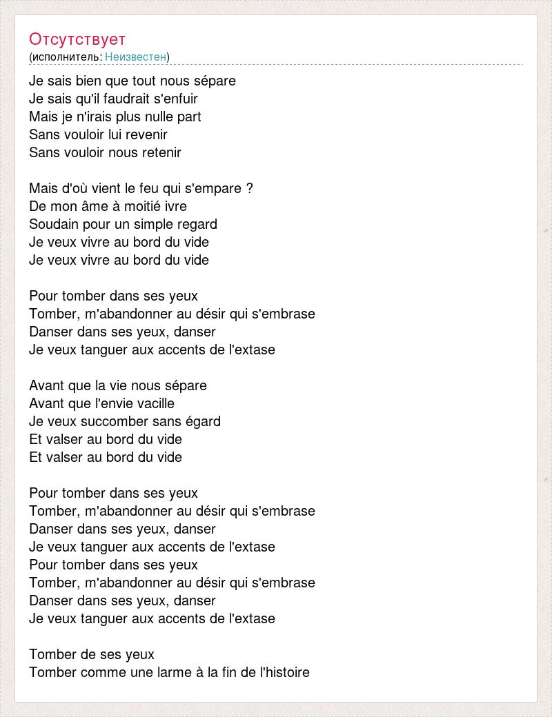 Je sais bien que tout nous sépare Je sais qu'il faudrait s'enfuir Mais je n'irais plus nulle part Sans vouloir lui revenir Sans vouloir nous retenir Mais d'où vient le feu qui s'empare ? De mon âme à moitié ivre Soudain pour un simple regard Je veux vivre au bord du vide Je veux vivre au bord du vide Pour tomber dans ses yeux Tomber, m'abandonner au désir qui s'embrase Danser dans ses yeux, danser Je veux tanguer aux accents de l'extase Avant que la vie nous sépare Avant que l'envie vacille Je veux succomber sans égard Et valser au bord du vide Et valser au bord du vide Pour tomber dans ses yeux Tomber, m'abandonner au désir qui s'embrase Danser dans ses yeux, danser Je veux tanguer aux accents de l'extase Pour tomber dans ses yeux Tomber, m'abandonner au désir qui s'embrase Danser dans ses yeux, danser Je veux tanguer aux accents de l'extase Tomber de ses yeux Tomber comme une larme à la fin de l'histoire
