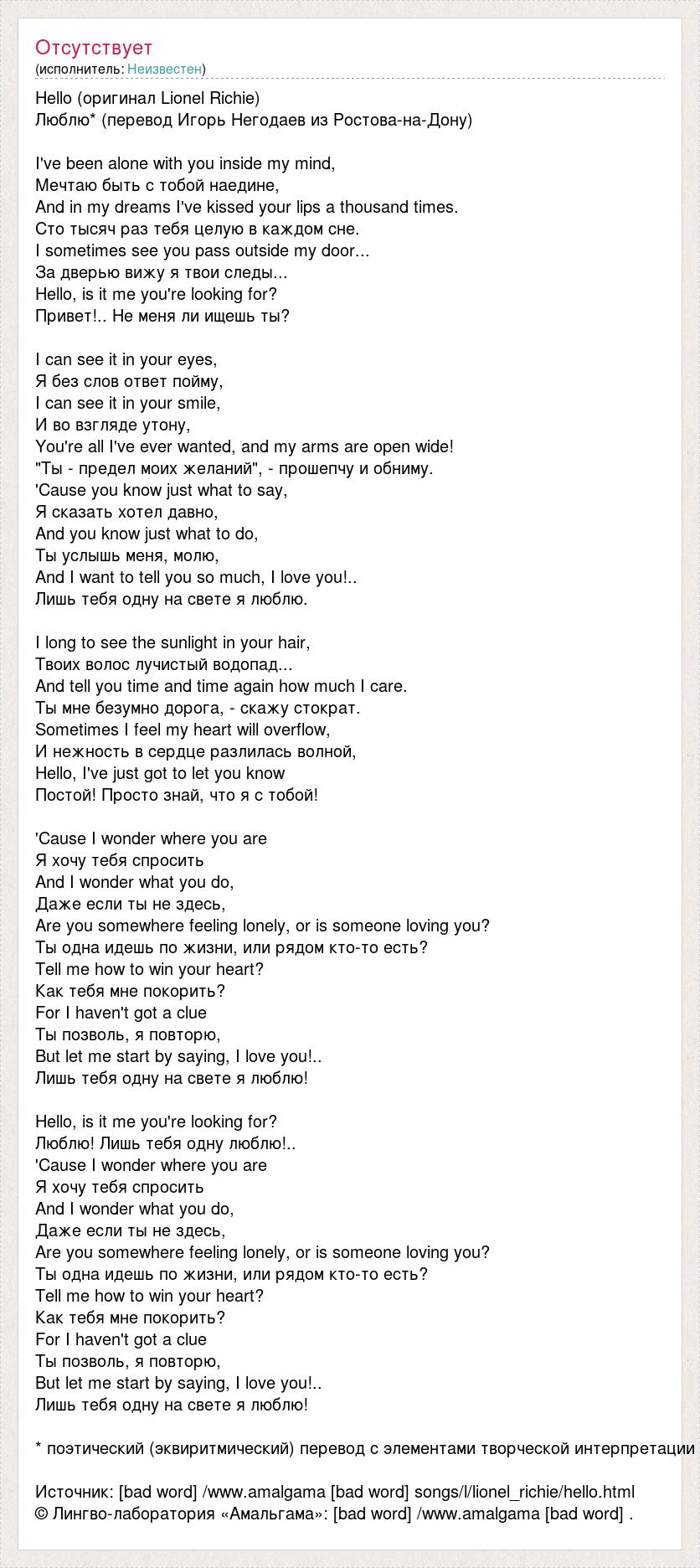 Hello (оригинал Lionel Richie) Люблю* (перевод Игорь Негодаев из Ростова-на-Дону) I've been alone with you inside my mind, Мечтаю быть с тобой наедине, And in my dreams I've kissed your lips a thousand times. Сто тысяч раз тебя целую в каждом сне. I sometimes see you pass outside my door... За дверью вижу я твои следы... Hello, is it me you're looking for? Привет!.. Не меня ли ищешь ты? I can see it in your eyes, Я без слов ответ пойму, I can see it in your smile, И во взгляде утону, You're all I've ever wanted, and my arms are open wide! "Ты - предел моих желаний", - прошепчу и обниму. 'Cause you know just what to say, Я сказать хотел давно, And you know just what to do, Ты услышь меня, молю, And I want to tell you so much, I love you!.. Лишь тебя одну на свете я люблю. I long to see the sunlight in your hair, Твоих волос лучистый водопад... And tell you time and time again how much I care. Ты мне безумно дорога, - скажу стократ. Sometimes I feel my heart will overflow, И нежность в сердце разлилась волной, Hello, I've just got to let you know Постой! Просто знай, что я с тобой! 'Cause I wonder where you are Я хочу тебя спросить And I wonder what you do, Даже если ты не здесь, Are you somewhere feeling lonely, or is someone loving you? Ты одна идешь по жизни, или рядом кто-то есть? Tell me how to win your heart? Как тебя мне покорить? For I haven't got a clue Ты позволь, я повторю, But let me start by saying, I love you!.. Лишь тебя одну на свете я люблю! Hello, is it me you're looking for? Люблю! Лишь тебя одну люблю!.. 'Cause I wonder where you are Я хочу тебя спросить And I wonder what you do, Даже если ты не здесь, Are you somewhere feeling lonely, or is someone loving you? Ты одна идешь по жизни, или рядом кто-то есть? Tell me how to win your heart? Как тебя мне покорить? For I haven't got a clue Ты позволь, я повторю, But let me start by saying, I love you!.. Лишь тебя одну на свете я люблю! * поэтический (эквиритмический) перевод с элементами творческой интерпретации Источник: [bad word] /www.amalgama [bad word] songs/l/lionel_richie/hello.html © Лингво-лаборатория «Амальгама»: [bad word] /www.amalgama [bad word] .