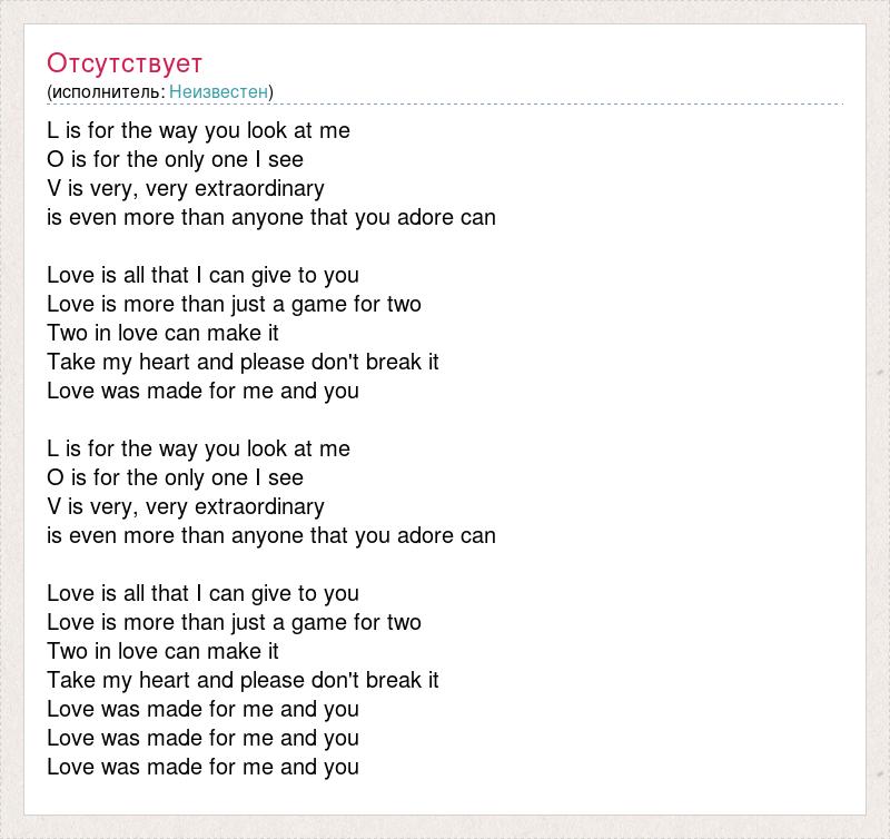 L is for the way you look at me O is for the only one I see V is very, very extraordinary is even more than anyone that you adore can Love is all that I can give to you Love is more than just a game for two Two in love can make it Take my heart and please don't break it Love was made for me and you L is for the way you look at me O is for the only one I see V is very, very extraordinary is even more than anyone that you adore can Love is all that I can give to you Love is more than just a game for two Two in love can make it Take my heart and please don't break it Love was made for me and you Love was made for me and you Love was made for me and you