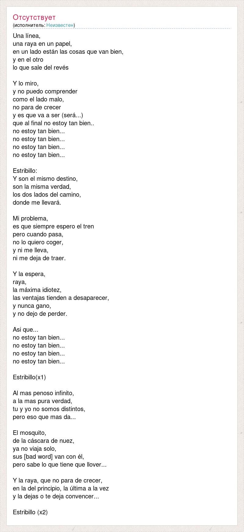 Una línea, una raya en un papel, en un lado están las cosas que van bien, y en el otro lo que sale del revés Y lo miro, y no puedo comprender como el lado malo, no para de crecer y es que va a ser (será...) que al final no estoy tan bien.. no estoy tan bien... no estoy tan bien... no estoy tan bien... no estoy tan bien... Estribillo: Y son el mismo destino, son la misma verdad, los dos lados del camino, donde me llevará. Mi problema, es que siempre espero el tren pero cuando pasa, no lo quiero coger, y ni me lleva, ni me deja de traer. Y la espera, raya, la máxima idiotez, las ventajas tienden a desaparecer, y nunca gano, y no dejo de perder. Asi que... no estoy tan bien... no estoy tan bien... no estoy tan bien... no estoy tan bien... Estribillo(x1) Al mas penoso infinito, a la mas pura verdad, tu y yo no somos distintos, pero eso que mas da... El mosquito, de la cáscara de nuez, ya no viaja solo, sus [bad word] van con él, pero sabe lo que tiene que llover... Y la raya, que no para de crecer, en la del principio, la última a la vez y la dejas o te deja convencer... Estribillo (x2)