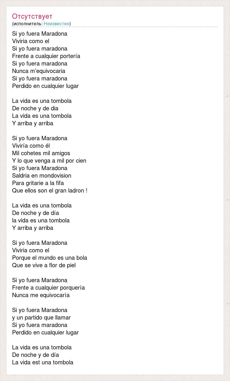 Si yo fuera Maradona Viviria como el Si yo fuera maradona Frente a cualquier portería Si yo fuera maradona Nunca m’equivocaria Si yo fuera maradona Perdido en cualquier lugar La vida es una tombola De noche y de dia La vida es una tombola Y arriba y arriba Si yo fuera Maradona Viviría como él Mil cohetes mil amigos Y lo que venga a mil por cien Si yo fuera Maradona Saldria en mondovision Para gritarie a la fifa Que ellos son el gran ladron ! La vida es una tombola De noche y de día la vida es una tombola Y arriba y arriba Si yo fuera Maradona Viviria como el Porque el mundo es una bola Que se vive a flor de piel Si yo fuera Maradona Frente a cualquier porquería Nunca me equivocaría Si yo fuera Maradona y un partido que llamar Si yo fuera maradona Perdido en cualquier lugar La vida es una tombola De noche y de día La vida est una tombola