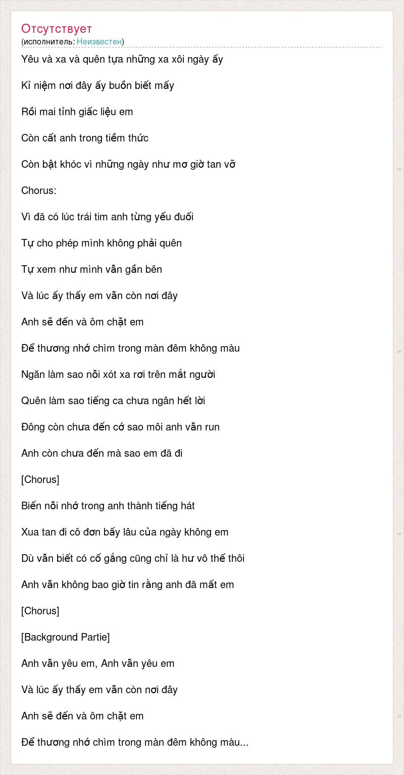 Yêu và xa và quên tựa những xa xôi ngày ấy Kỉ niệm nơi đây ấy buồn biết mấy Rồi mai tỉnh giấc liệu em Còn cất anh trong tiềm thức Còn bật khóc vì những ngày như mơ giờ tan vỡ Chorus: Vì đã có lúc trái tim anh từng yếu đuối Tự cho phép mình không phải quên Tự xem như mình vẫn gần bên Và lúc ấy thấy em vẫn còn nơi đây Anh sẽ đến và ôm chặt em Để thương nhớ chìm trong màn đêm không màu Ngăn làm sao nỗi xót xa rơi trên mắt người Quên làm sao tiếng ca chưa ngân hết lời Đông còn chưa đến cớ sao môi anh vẫn run Anh còn chưa đến mà sao em đã đi [Chorus] Biến nỗi nhớ trong anh thành tiếng hát Xua tan đi cô đơn bấy lâu của ngày không em Dù vẫn biết có cố gắng cũng chỉ là hư vô thế thôi Anh vẫn không bao giờ tin rằng anh đã mất em [Chorus] [Background Partie] Anh vẫn yêu em, Anh vẫn yêu em Và lúc ấy thấy em vẫn còn nơi đây Anh sẽ đến và ôm chặt em Để thương nhớ chìm trong màn đêm không màu...