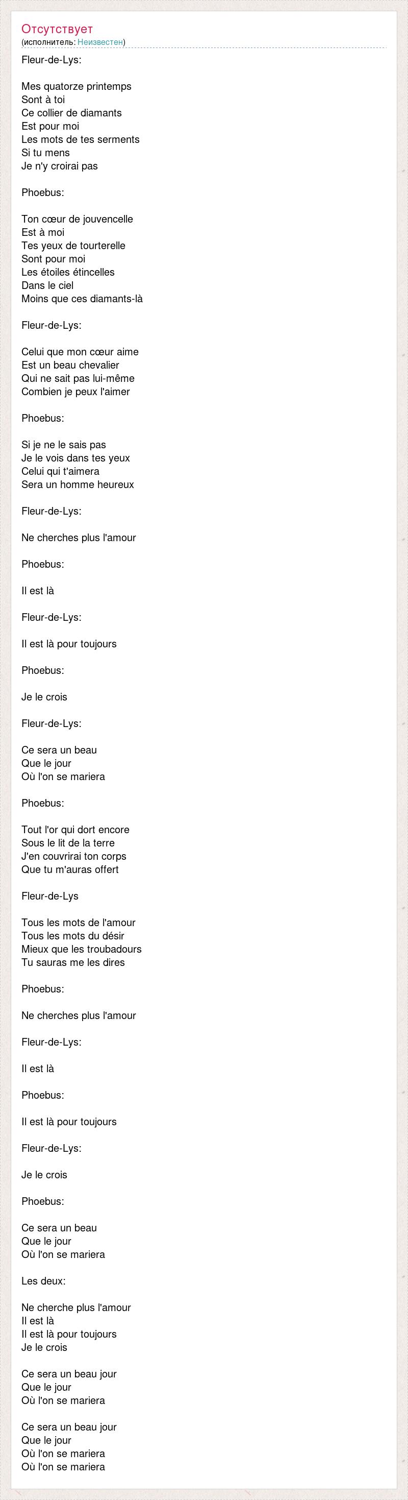 Fleur-de-Lys: Mes quatorze printemps Sont à toi Ce collier de diamants Est pour moi Les mots de tes serments Si tu mens Je n'y croirai pas Phoebus: Ton cœur de jouvencelle Est à moi Tes yeux de tourterelle Sont pour moi Les étoiles étincelles Dans le ciel Moins que ces diamants-là Fleur-de-Lys: Celui que mon cœur aime Est un beau chevalier Qui ne sait pas lui-même Combien je peux l'aimer Phoebus: Si je ne le sais pas Je le vois dans tes yeux Celui qui t'aimera Sera un homme heureux Fleur-de-Lys: Ne cherches plus l'amour Phoebus: Il est là Fleur-de-Lys: Il est là pour toujours Phoebus: Je le crois Fleur-de-Lys: Ce sera un beau Que le jour Où l'on se mariera Phoebus: Tout l'or qui dort encore Sous le lit de la terre J'en couvrirai ton corps Que tu m'auras offert Fleur-de-Lys Tous les mots de l'amour Tous les mots du désir Mieux que les troubadours Tu sauras me les dires Phoebus: Ne cherches plus l'amour Fleur-de-Lys: Il est là Phoebus: Il est là pour toujours Fleur-de-Lys: Je le crois Phoebus: Ce sera un beau Que le jour Où l'on se mariera Les deux: Ne cherche plus l'amour Il est là Il est là pour toujours Je le crois Ce sera un beau jour Que le jour Où l'on se mariera Ce sera un beau jour Que le jour Où l'on se mariera Où l'on se mariera