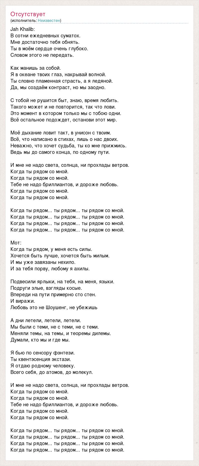 Jah Khalib: В сотни ежедневных суматох. Мне достаточно тебя обнять. Ты в моём сердце очень глубоко. Словом этого не передать. Как манишь за собой. Я в океане твоих глаз, накрывай волной. Ты словно пламенная страсть, а я ледяной. Да, мы создаём контраст, но мы заодно. С тобой не рушится быт, знаю, время любить. Такого может и не повторится, так что лови. Это момент в котором только мы с тобою одни. Всё остальное подождет, останови этот мир. Моё дыхание ловит такт, в унисон с твоим. Всё, что написано в стихах, лишь о нас двоих. Неважно, что хочет судьба, ты ко мне прижмись. Ведь мы до самого конца, по одному пути. И мне не надо света, солнца, ни прохлады ветров. Когда ты рядом со мной. Когда ты рядом со мной. Тебе не надо бриллиантов, и дороже любовь. Когда ты рядом со мной. Когда ты рядом со мной. Когда ты рядом... ты рядом... ты рядом со мной. Когда ты рядом... ты рядом... ты рядом со мной. Когда ты рядом... ты рядом... ты рядом со мной. Когда ты рядом... ты рядом... ты рядом со мной. Мот: Когда ты рядом, у меня есть силы. Хочется быть лучше, хочется быть милым. И мы уже завязаны нехило. И за тебя порву, любому я ахилы. Подвесили ярлыки, на тебя, на меня, языки. Подруги злые, взгляды косые. Впереди на пути примерно сто стен. И виражи. Любовь это не Шоушенг, не убежишь А дни летели, летели, летели. Мы были с теми, не с теми, не с теми. Меняли темы, на темы, и теоремы дилемы. Думали, кто мы и где мы. Я бью по сенсору фэнтези. Ты квентэсенция экстази. Я отдаю родному человеку. Всего себя, до атомов, до молекул. И мне не надо света, солнца, ни прохлады ветров. Когда ты рядом со мной. Когда ты рядом со мной. Тебе не надо бриллиантов, и дороже любовь. Когда ты рядом со мной. Когда ты рядом со мной. Когда ты рядом... ты рядом... ты рядом со мной. Когда ты рядом... ты рядом... ты рядом со мной. Когда ты рядом... ты рядом... ты рядом со мной. Когда ты рядом... ты рядом... ты рядом со мной.