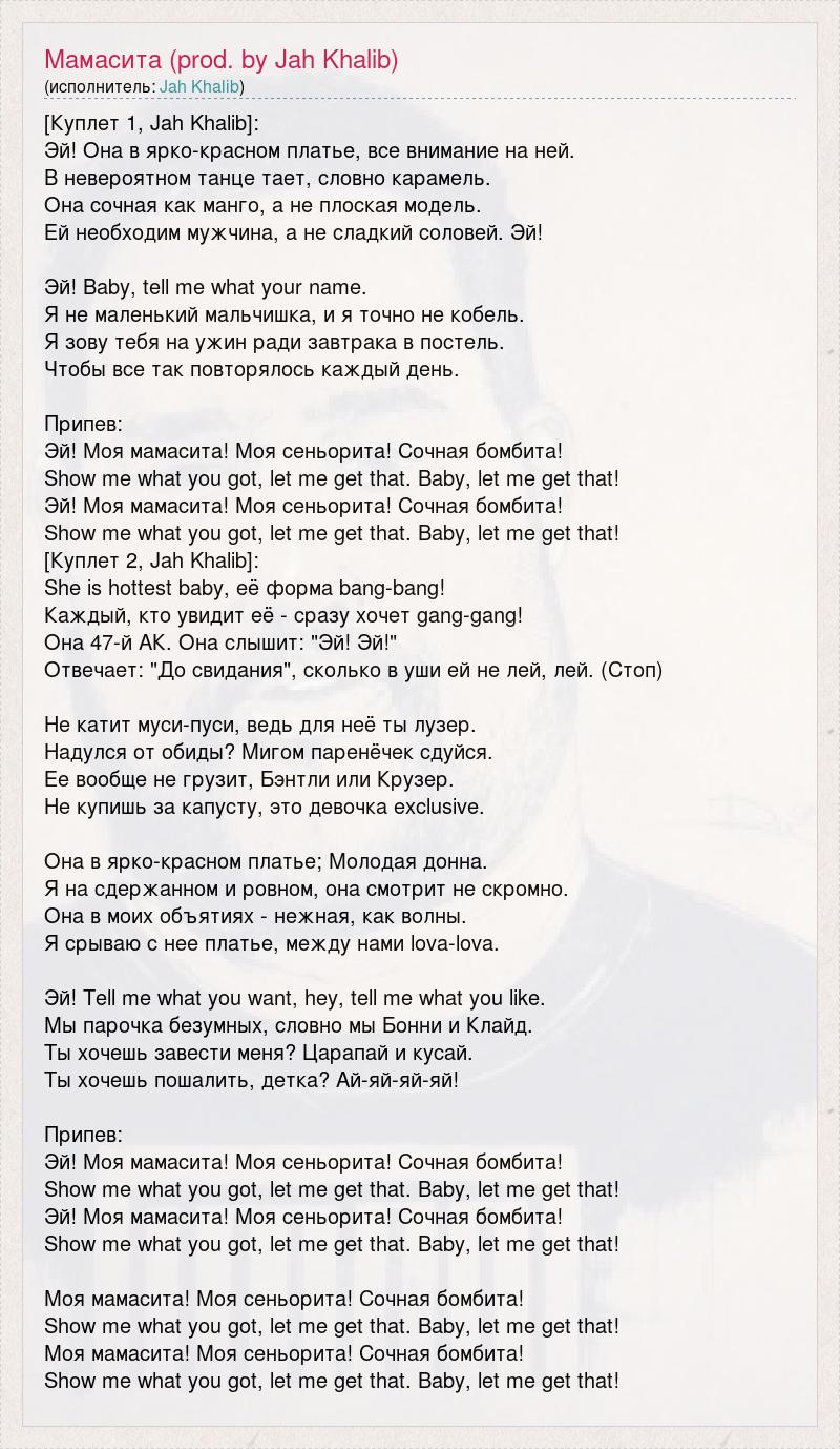 [Куплет 1, Jah Khalib]: Эй! Она в ярко-красном платье, все внимание на ней. В невероятном танце тает, словно карамель. Она сочная как манго, а не плоская модель. Ей необходим мужчина, а не сладкий соловей. Эй! Эй! Baby, tell me what your name. Я не маленький мальчишка, и я точно не кобель. Я зову тебя на ужин ради завтрака в постель. Чтобы все так повторялось каждый день. Припев: Эй! Моя мамасита! Моя сеньорита! Сочная бомбита! Show me what you got, let me get that. Baby, let me get that! Эй! Моя мамасита! Моя сеньорита! Сочная бомбита! Show me what you got, let me get that. Baby, let me get that! [Куплет 2, Jah Khalib]: She is hottest baby, её форма bang-bang! Каждый, кто увидит её - сразу хочет gang-gang! Она 47-й АК. Она слышит: "Эй! Эй!" Отвечает: "До свидания", сколько в уши ей не лей, лей. (Стоп) Не катит муси-пуси, ведь для неё ты лузер. Надулся от обиды? Мигом паренёчек сдуйся. Ее вообще не грузит, Бэнтли или Крузер. Не купишь за капусту, это девочка exclusive. Она в ярко-красном платье; Молодая донна. Я на сдержанном и ровном, она смотрит не скромно. Она в моих объятиях - нежная, как волны. Я срываю с нее платье, между нами lova-lova. Эй! Tell me what you want, hey, tell me what you like. Мы парочка безумных, словно мы Бонни и Клайд. Ты хочешь завести меня? Царапай и кусай. Ты хочешь пошалить, детка? Ай-яй-яй-яй! Припев: Эй! Моя мамасита! Моя сеньорита! Сочная бомбита! Show me what you got, let me get that. Baby, let me get that! Эй! Моя мамасита! Моя сеньорита! Сочная бомбита! Show me what you got, let me get that. Baby, let me get that! Моя мамасита! Моя сеньорита! Сочная бомбита! Show me what you got, let me get that. Baby, let me get that! Моя мамасита! Моя сеньорита! Сочная бомбита! Show me what you got, let me get that. Baby, let me get that!