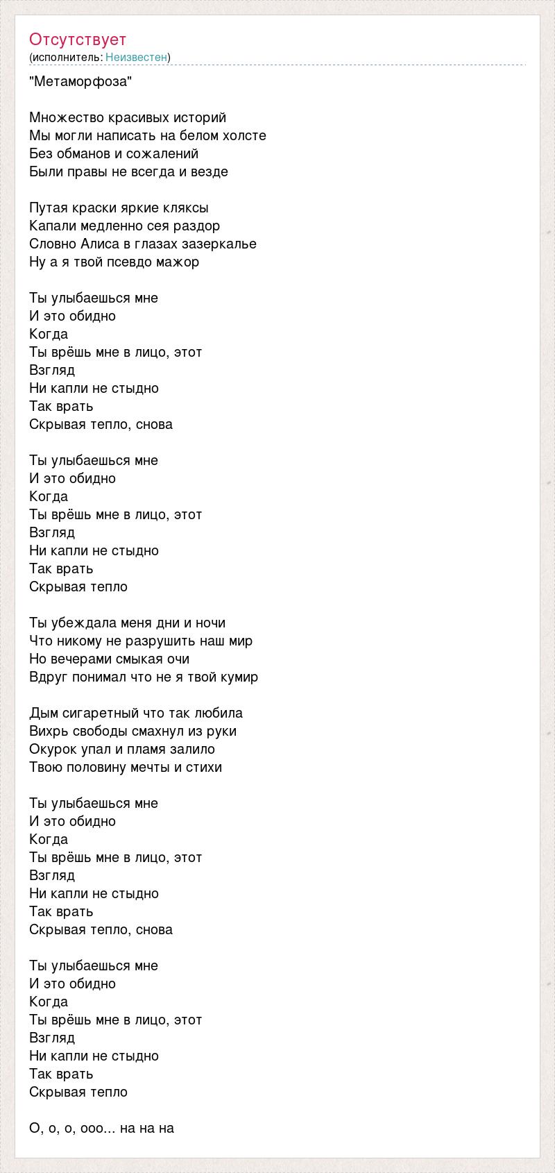 "Метаморфоза" Множество красивых историй Мы могли написать на белом холсте Без обманов и сожалений Были правы не всегда и везде Путая краски яркие кляксы Капали медленно сея раздор Словно Алиса в глазах зазеркалье Ну а я твой псевдо мажор Ты улыбаешься мне И это обидно Когда Ты врёшь мне в лицо, этот Взгляд Ни капли не стыдно Так врать Скрывая тепло, снова Ты улыбаешься мне И это обидно Когда Ты врёшь мне в лицо, этот Взгляд Ни капли не стыдно Так врать Скрывая тепло Ты убеждала меня дни и ночи Что никому не разрушить наш мир Но вечерами смыкая очи Вдруг понимал что не я твой кумир Дым сигаретный что так любила Вихрь свободы смахнул из руки Окурок упал и пламя залило Твою половину мечты и стихи Ты улыбаешься мне И это обидно Когда Ты врёшь мне в лицо, этот Взгляд Ни капли не стыдно Так врать Скрывая тепло, снова Ты улыбаешься мне И это обидно Когда Ты врёшь мне в лицо, этот Взгляд Ни капли не стыдно Так врать Скрывая тепло О, о, о, ооо... на на на