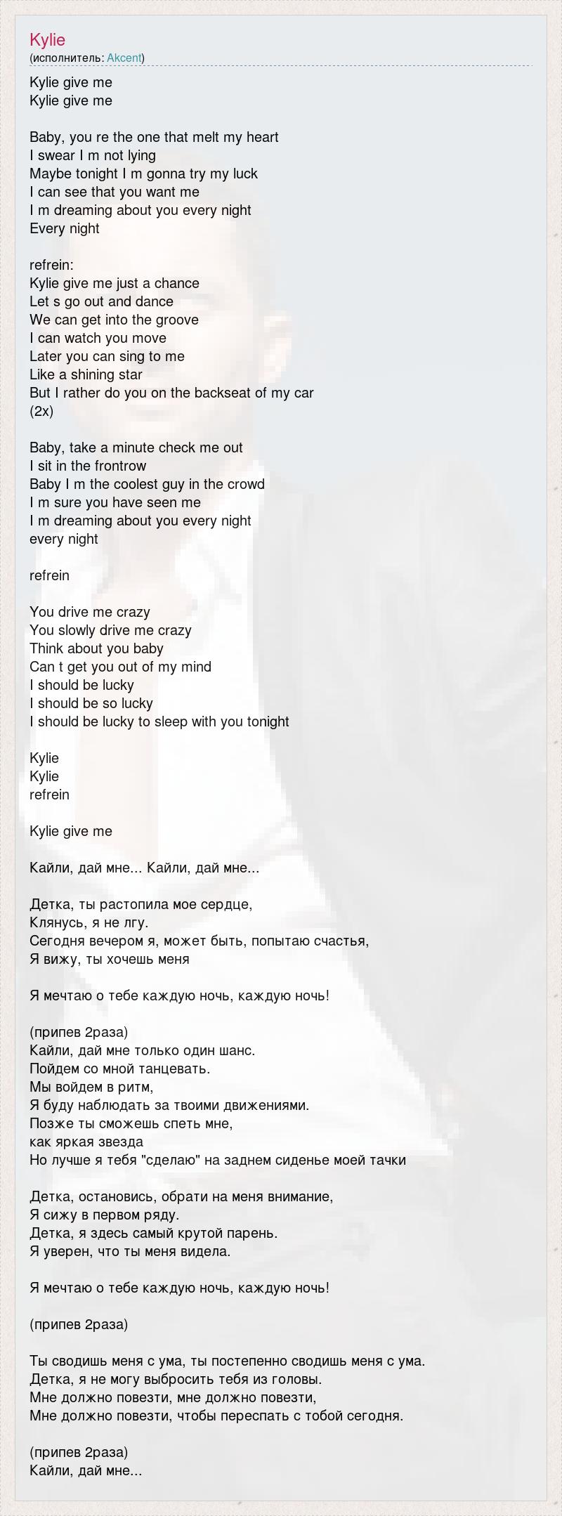 Kylie give me Kylie give me Baby, you re the one that melt my heart I swear I m not lying Maybe tonight I m gonna try my luck I can see that you want me I m dreaming about you every night Every night refrein: Kylie give me just a chance Let s go out and dance We can get into the groove I can watch you move Later you can sing to me Like a shining star But I rather do you on the backseat of my car (2x) Baby, take a minute check me out I sit in the frontrow Baby I m the coolest guy in the crowd I m sure you have seen me I m dreaming about you every night every night refrein You drive me crazy You slowly drive me crazy Think about you baby Can t get you out of my mind I should be lucky I should be so lucky I should be lucky to sleep with you tonight Kylie Kylie refrein Kylie give me Кайли, дай мне... Кайли, дай мне... Детка, ты растопила мое сердце, Клянусь, я не лгу. Сегодня вечером я, может быть, попытаю счастья, Я вижу, ты хочешь меня Я мечтаю о тебе каждую ночь, каждую ночь! (припев 2раза) Кайли, дай мне только один шанс. Пойдем со мной танцевать. Мы войдем в ритм, Я буду наблюдать за твоими движениями. Позже ты сможешь спеть мне, как яркая звезда Но лучше я тебя "сделаю" на заднем сиденье моей тачки Детка, остановись, обрати на меня внимание, Я сижу в первом ряду. Детка, я здесь самый крутой парень. Я уверен, что ты меня видела. Я мечтаю о тебе каждую ночь, каждую ночь! (припев 2раза) Ты сводишь меня с ума, ты постепенно сводишь меня с ума. Детка, я не могу выбросить тебя из головы. Мне должно повезти, мне должно повезти, Мне должно повезти, чтобы переспать с тобой сегодня. (припев 2раза) Кайли, дай мне...