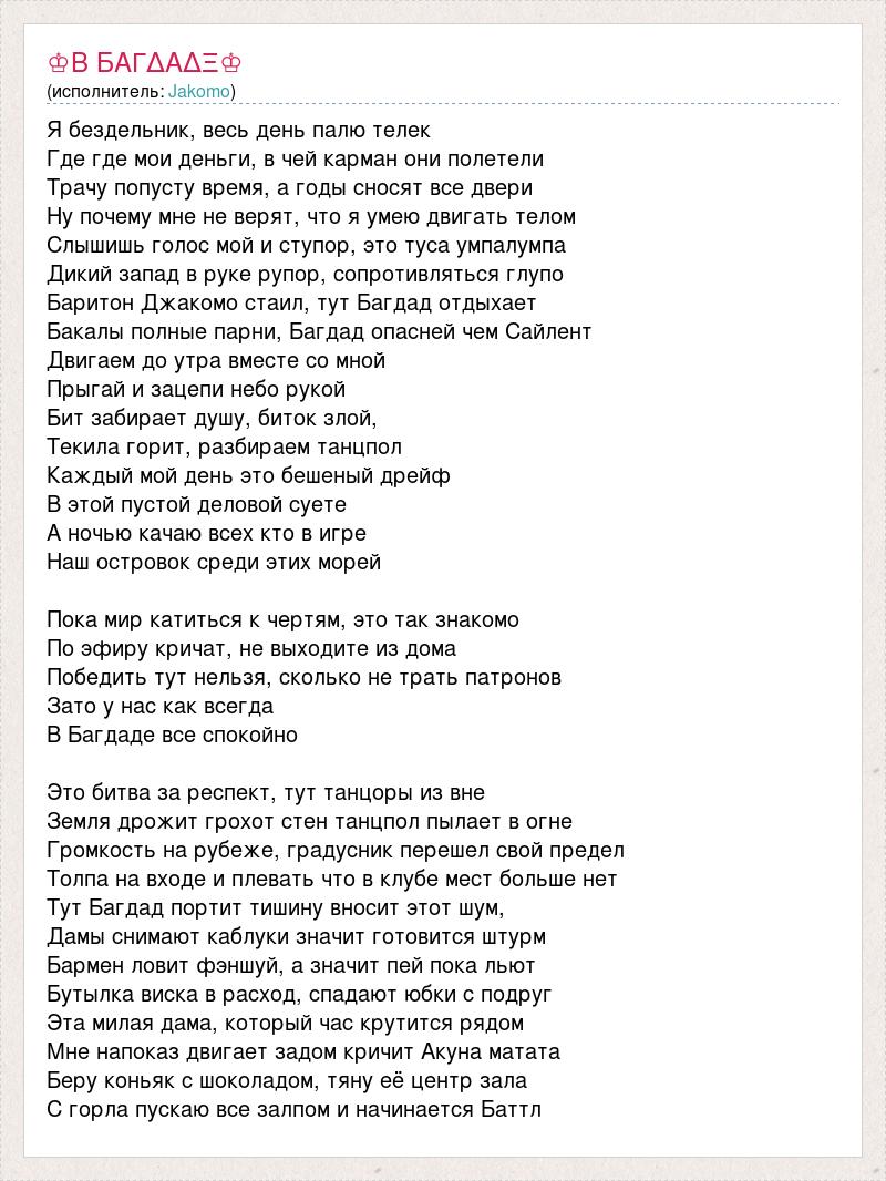 Я бездельник, весь день палю телек Где где мои деньги, в чей карман они полетели Трачу попусту время, а годы сносят все двери Ну почему мне не верят, что я умею двигать телом Слышишь голос мой и ступор, это туса умпалумпа Дикий запад в руке рупор, сопротивляться глупо Баритон Джакомо стаил, тут Багдад отдыхает Бакалы полные парни, Багдад опасней чем Сайлент Двигаем до утра вместе со мной Прыгай и зацепи небо рукой Бит забирает душу, биток злой, Текила горит, разбираем танцпол Каждый мой день это бешеный дрейф В этой пустой деловой суете А ночью качаю всех кто в игре Наш островок среди этих морей Пока мир катиться к чертям, это так знакомо По эфиру кричат, не выходите из дома Победить тут нельзя, сколько не трать патронов Зато у нас как всегда В Багдаде все спокойно Это битва за респект, тут танцоры из вне Земля дрожит грохот стен танцпол пылает в огне Громкость на рубеже, градусник перешел свой предел Толпа на входе и плевать что в клубе мест больше нет Тут Багдад портит тишину вносит этот шум, Дамы снимают каблуки значит готовится штурм Бармен ловит фэншуй, а значит пей пока льют Бутылка виска в расход, спадают юбки с подруг Эта милая дама, который час крутится рядом Мне напоказ двигает задом кричит Акуна матата Беру коньяк с шоколадом, тяну её центр зала С горла пускаю все залпом и начинается Баттл